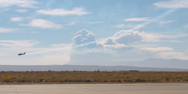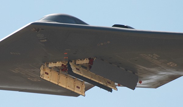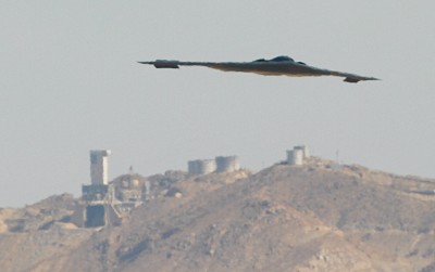 The B-2 Spirit Stealth Bomber Spirit of New York above the rocket test stands.