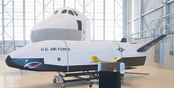A mockup of the shuttle used for training rescue crews, an 80% scale model of the X-37, and the world's first laser-powered airplane.