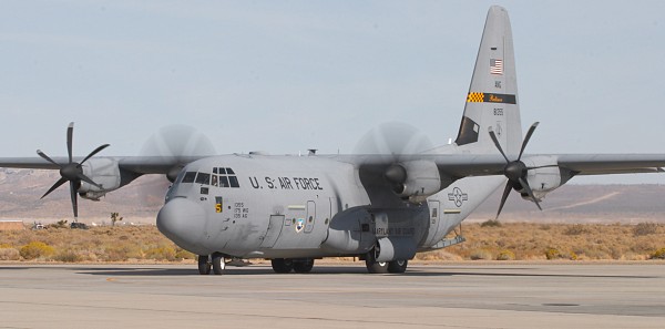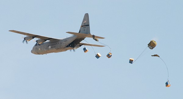 A C-130J demonstrates a cargo drop. The bottom of each pallet is made of foot-thick crushable cardboard.