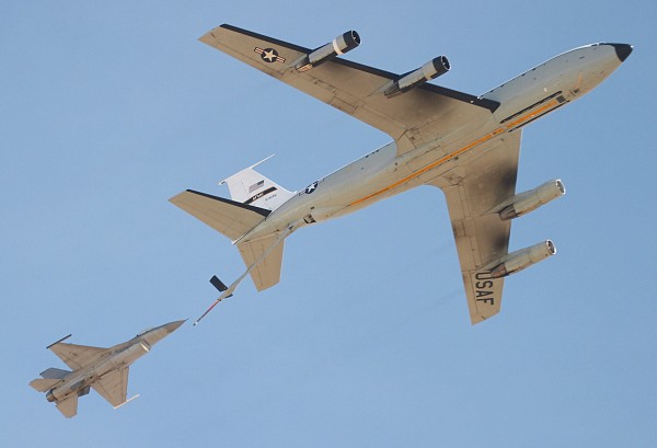 An F-16 Falcon demonstrates in-flight (mid-air) refueling with a KC-135 Stratotanker.