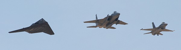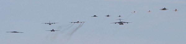 From left to right is a B2, C130, B1B, KC135, F117A, F15, F16, C17A, L39, T38, another F15, and another F16.